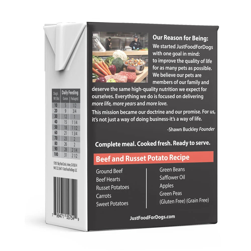 JustFoodForDogs’ Beef & Russet Potato Recipe is formulated to meet the nutritional levels established by the AAFCO Dog Food Nutrient Profiles for maintenance.